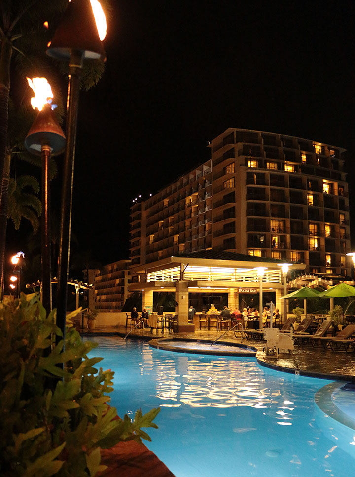金曜日の夜なら、プールサイドからすぐ近くにある一大リゾート「ヒルトン・ハワイアン・ビレッジ」で上がる毎週恒例の花火も間近に観ることができます。得した気分になること請け合いのプールサイド・レセプション、お見逃しのないように!
