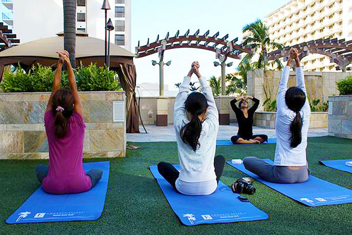 場所は4階グランドラナイのプールサイド。毎週月、水、金曜日の午前7時から、1時間のヨガレッスンが受けられます。日英バイリンガルの公認インストラクターが1時間のレッスンを丁寧に指導してくれるので、言葉の心配もありません。ヨガマットも無料で用意されているので、動きやすい服装をして参加するだけでOKです。